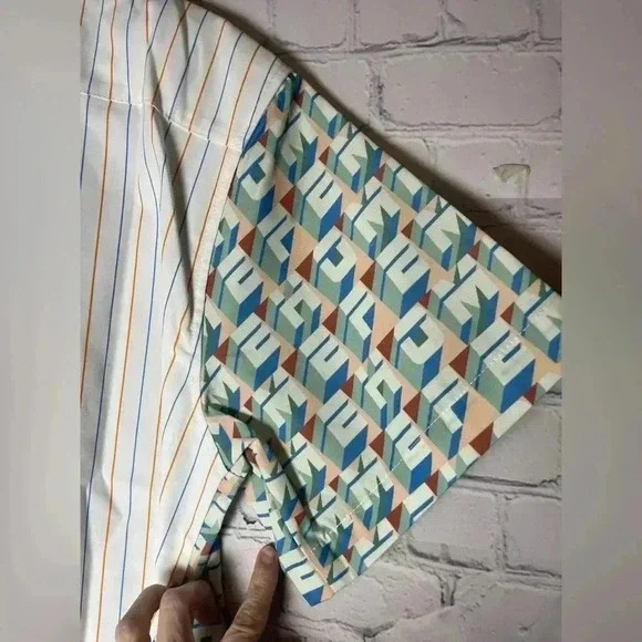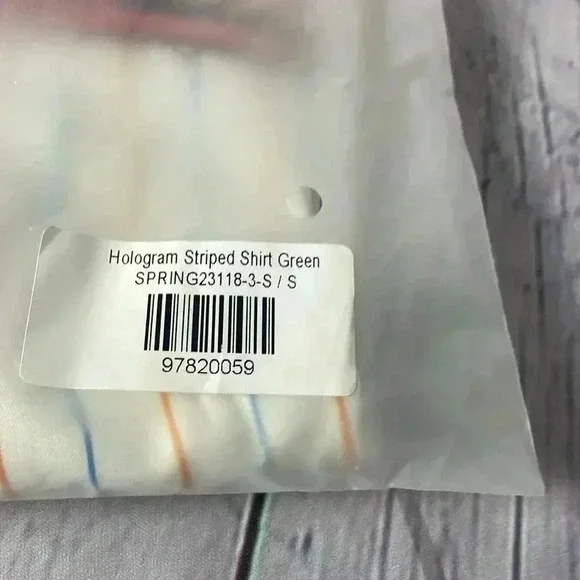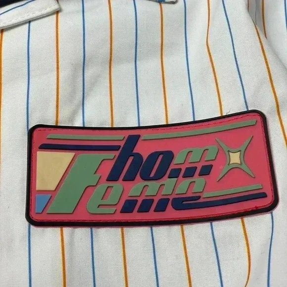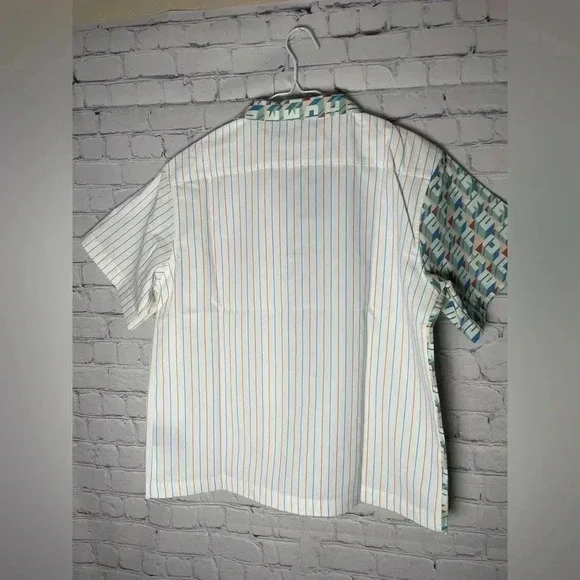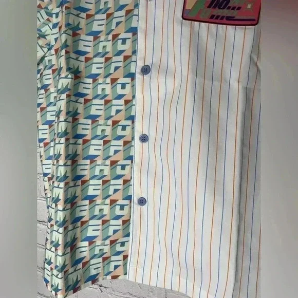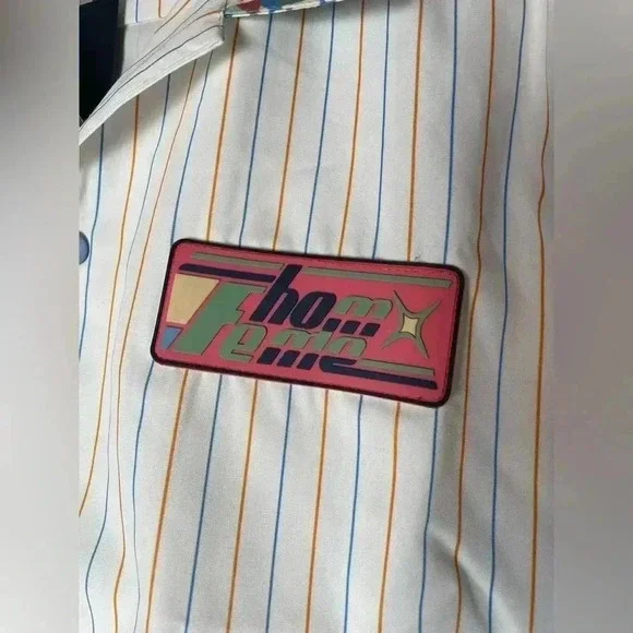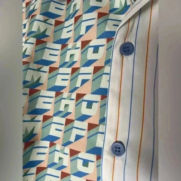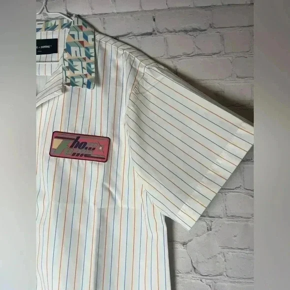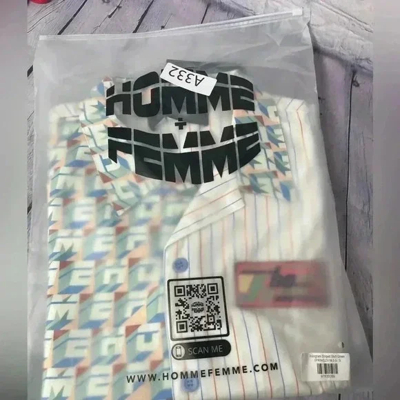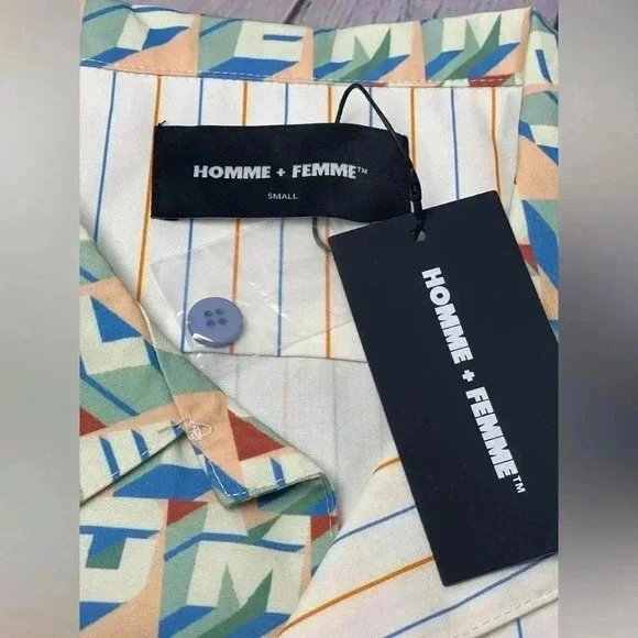 NWT Mens Size SThe Homme + Femme Button Down Short Sleeve Shirt offers a boxy fit with true to size styling. It's crafted with a hologramed stripe pattern in classic color combinations orange/sky blue. The silicone patch on the left side features the Homme + Femme signature.This shirt is fashion-forward and timeless.Extra Button100% Polyester Hand WashPit-Pit 23”Length 26”Sleeve 8.5”Stylish, Street Wear, Y2K, Retro, 90s, 2020s, Vintage, Street Wear Couture, Urban Meets Upscale, Gritty, Iconic, Raw Essence, Refined, Fearless Style, Urban Sophisticated, Freaknik Festival, Nostalgia Meets Modern-see all pics for any wear. no rips or tears-From Smoke Free Environment-item shown is the exact item you will receive.** Be sure to Follow us, We post several shoes / items often, and offer discounts when you bundle.