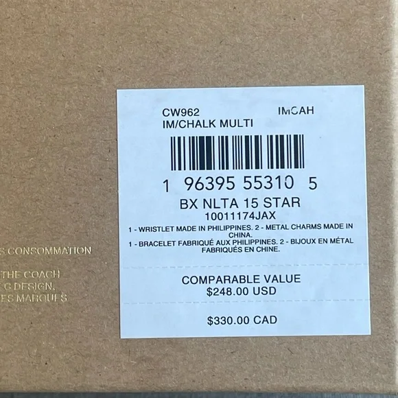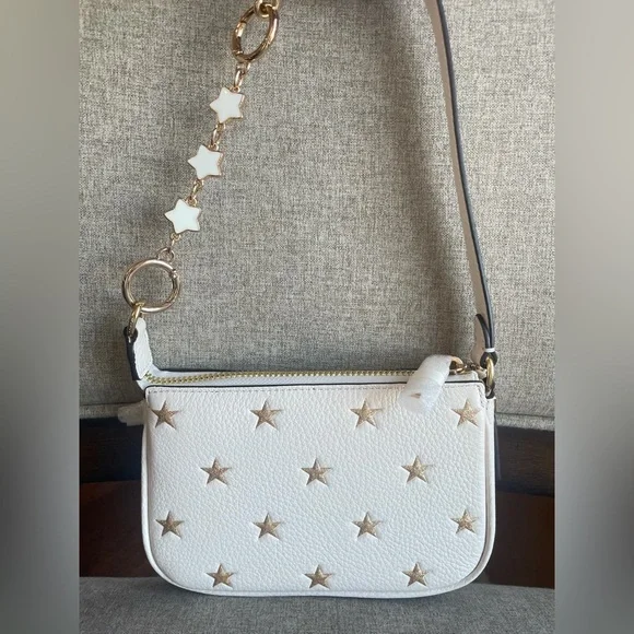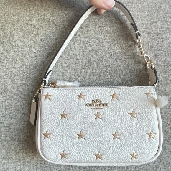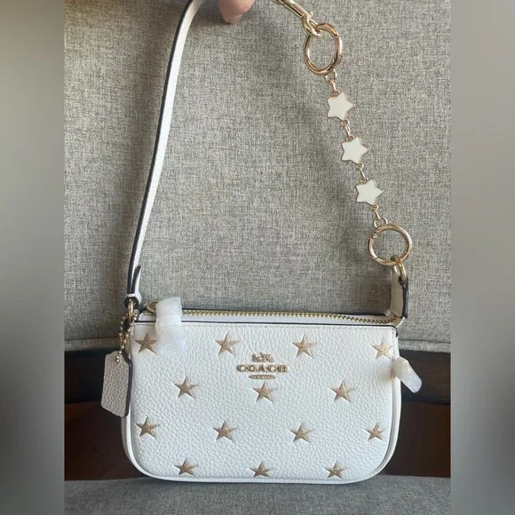 BOXED NOLITA BAG 15 WITH STAR PRINT (COACH CW962)GOLD/CHALK MULTICOACH STYLE # CW962| Refined pebble leather | Two credit card slots | Zip-top closure, fabric lining | Handle with 4 1/2" drop | 6" (L) x 4" (H) x 1 1/2" (W) | Includes removable charms | Packaged in a Coach gift box with ribbon|Style No. CW962|