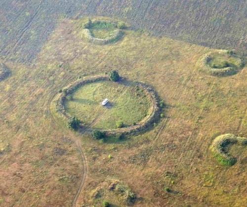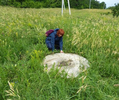 Каменный мельничный жернов торчит из земли недалеко от дороги на северной окраине Торнового
