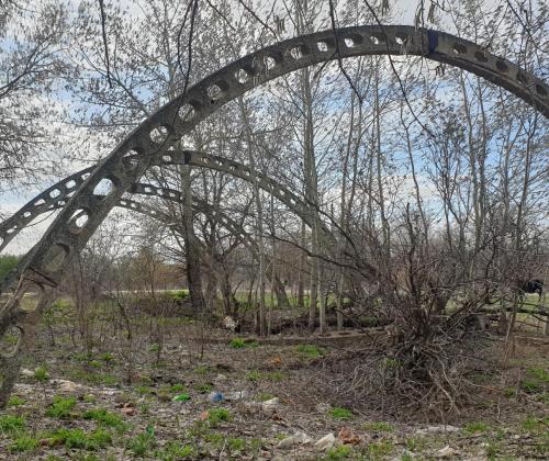 Красивые арочные конструкции из бетона для коровников, на въезде в село Выползово