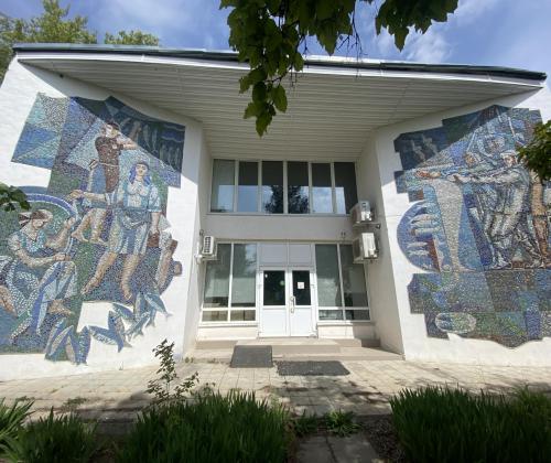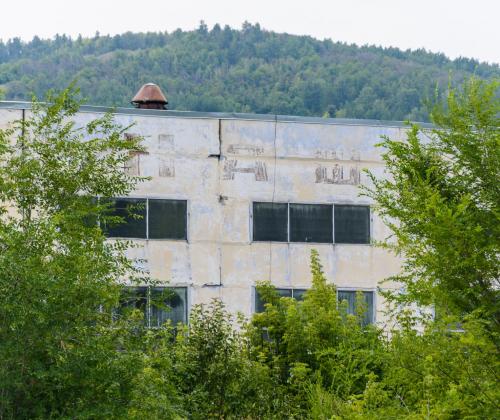 Два больших мозаичных панно на фасаде бывшего магазина при рыбзаводе
