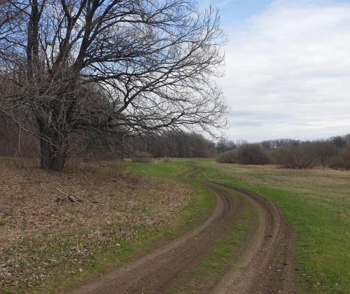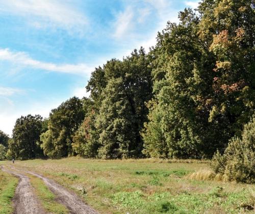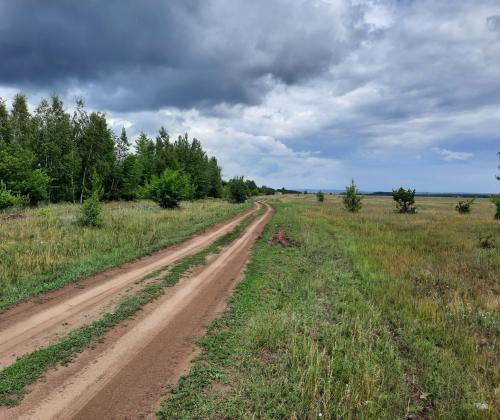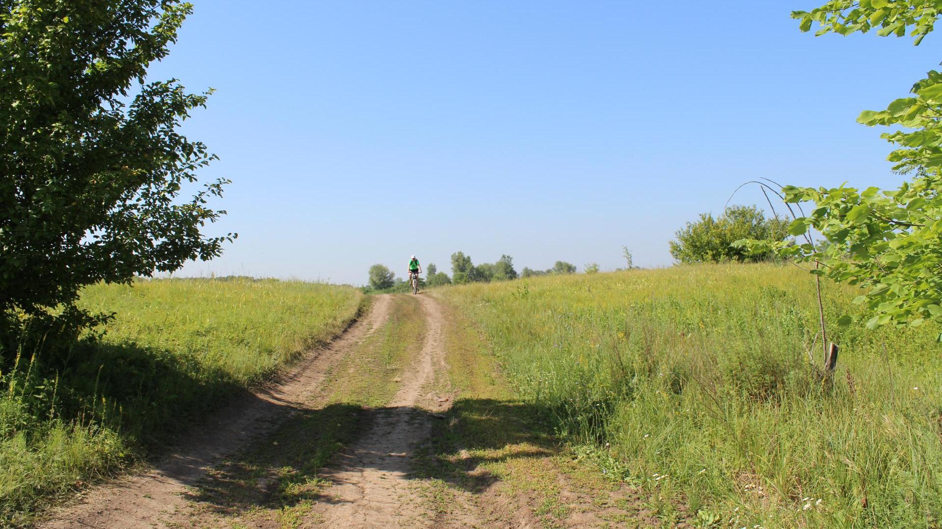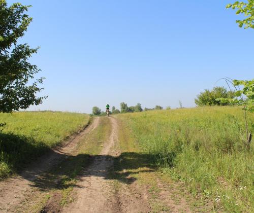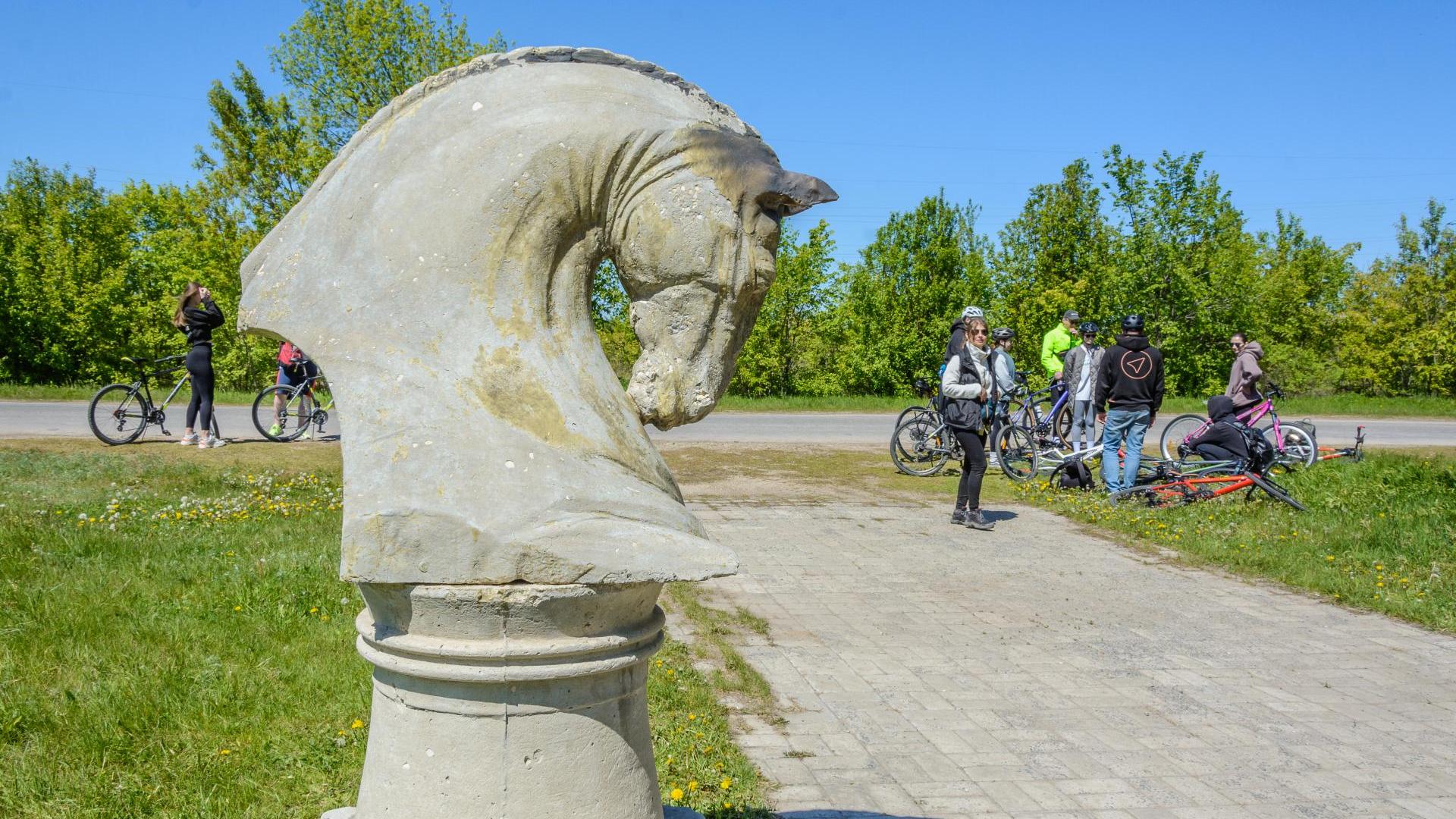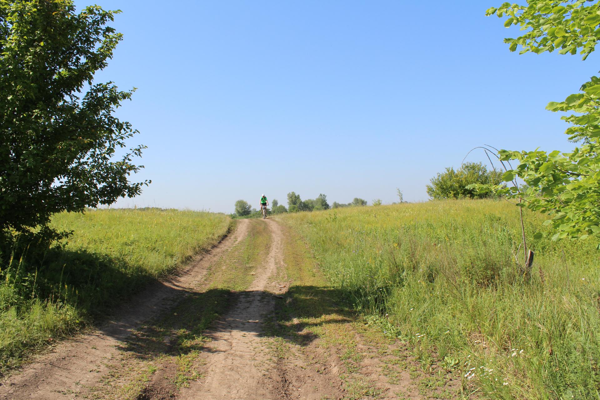 Далее дорога идёт в восточном направлении по кромке большого заросшего поля – бывшей взлётно-посадочной полосы. Примерно через полтора километра после авиамонумента дорога поворачивает направо под 90˚, а ещё через 500 метров – налево. Пройдя через небольшую рощу, через 900 метров грунтовка вновь поворачивает направо и выводит к асфальтовой дороге у посёлка Усинский (своего рода «пригород» Рождествено). Здесь можно посмотреть на оригинальные скульптуры в виде шахматных коней перед воротами частной конефермы, после чего уйти с асфальта вправо, в сторону волжских проток.