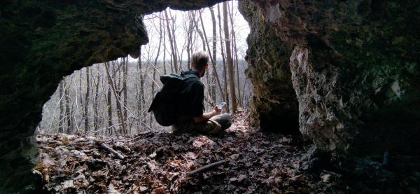 Несколько гротов разного размера на склоне поросшей лесом горы