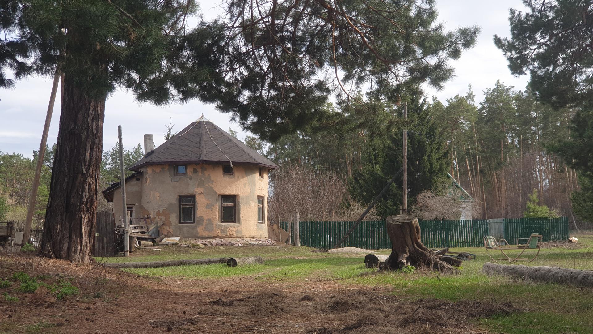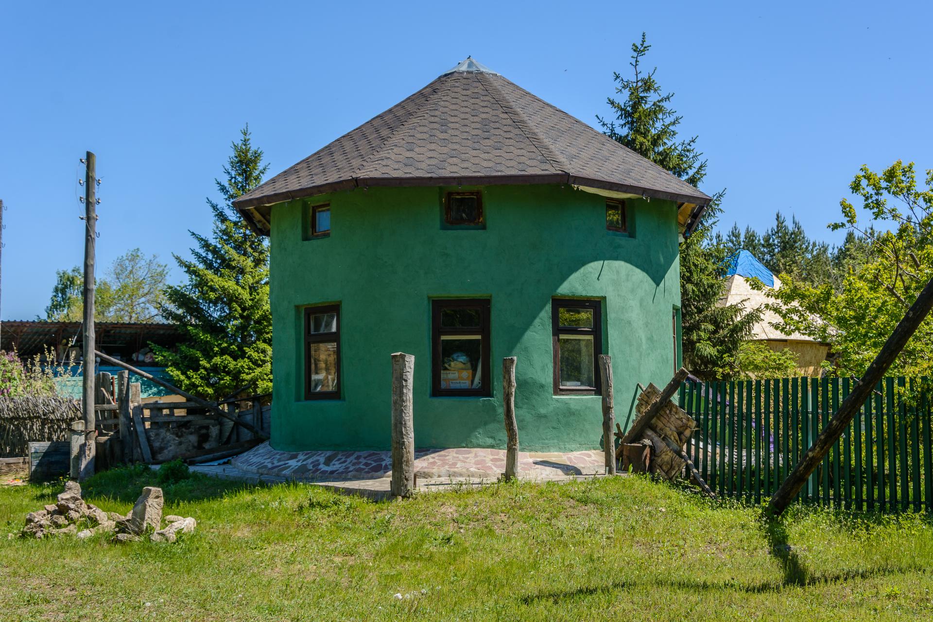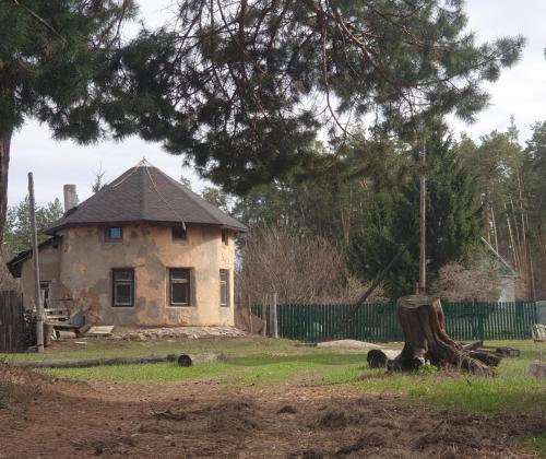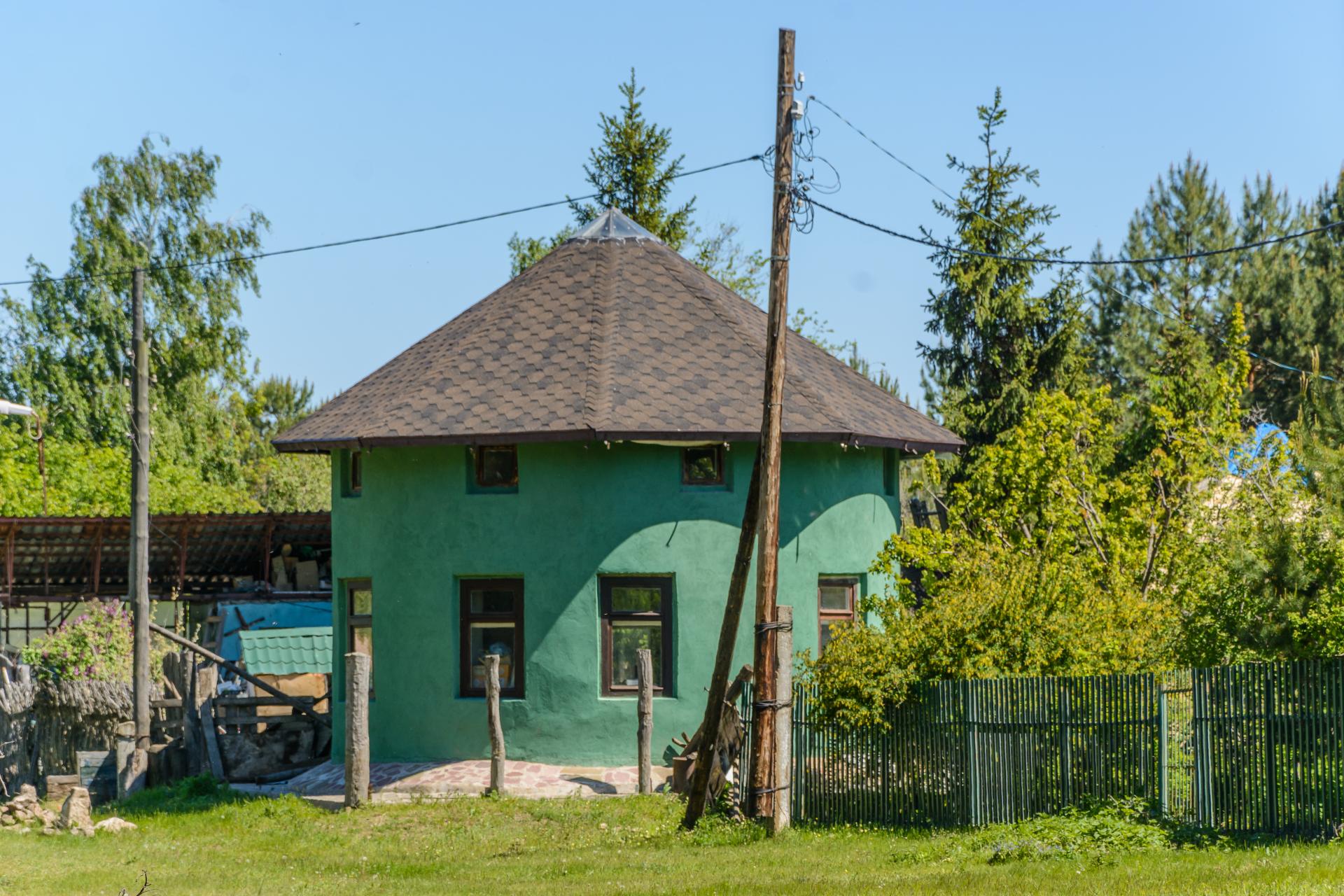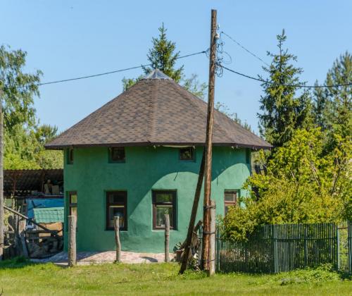 Посмотреть на карте Дом необычной круглой формы стоит на окраине села Выползово, недалеко от опушки бора. Его построил один из местных жителей в 2016 году.
