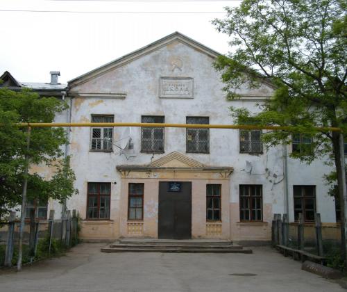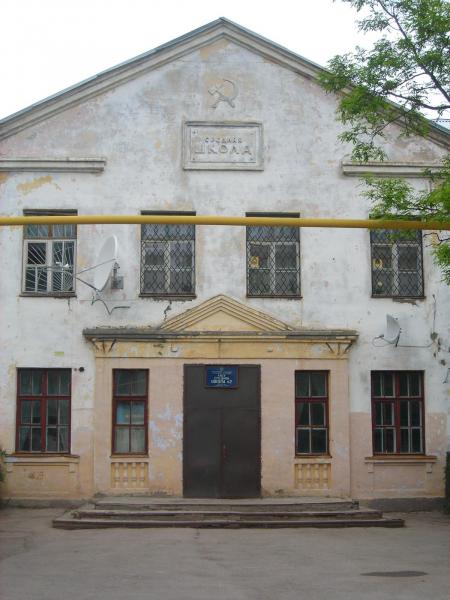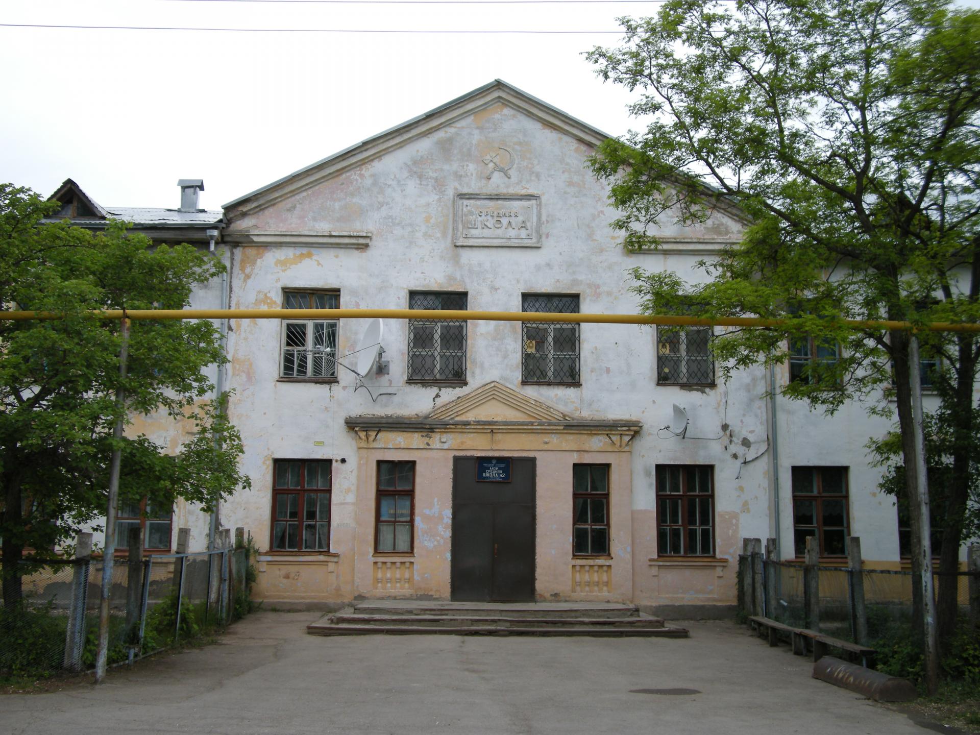 Двухэтажное каменное здание школы постройки 1950 года с лепниной в виде серпа и молота над центральным входом