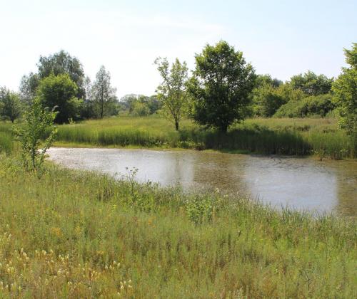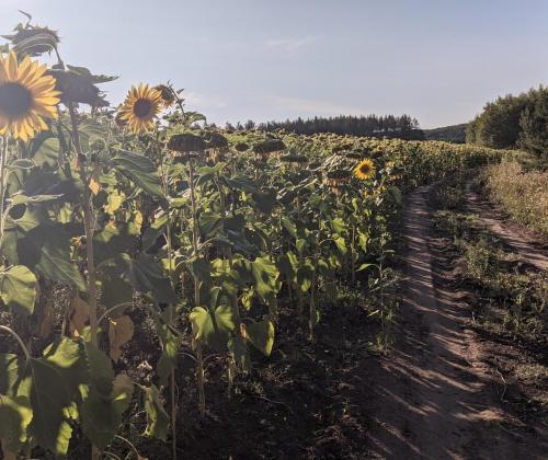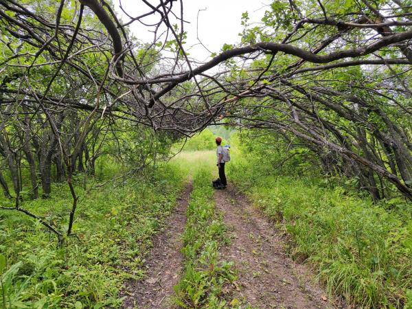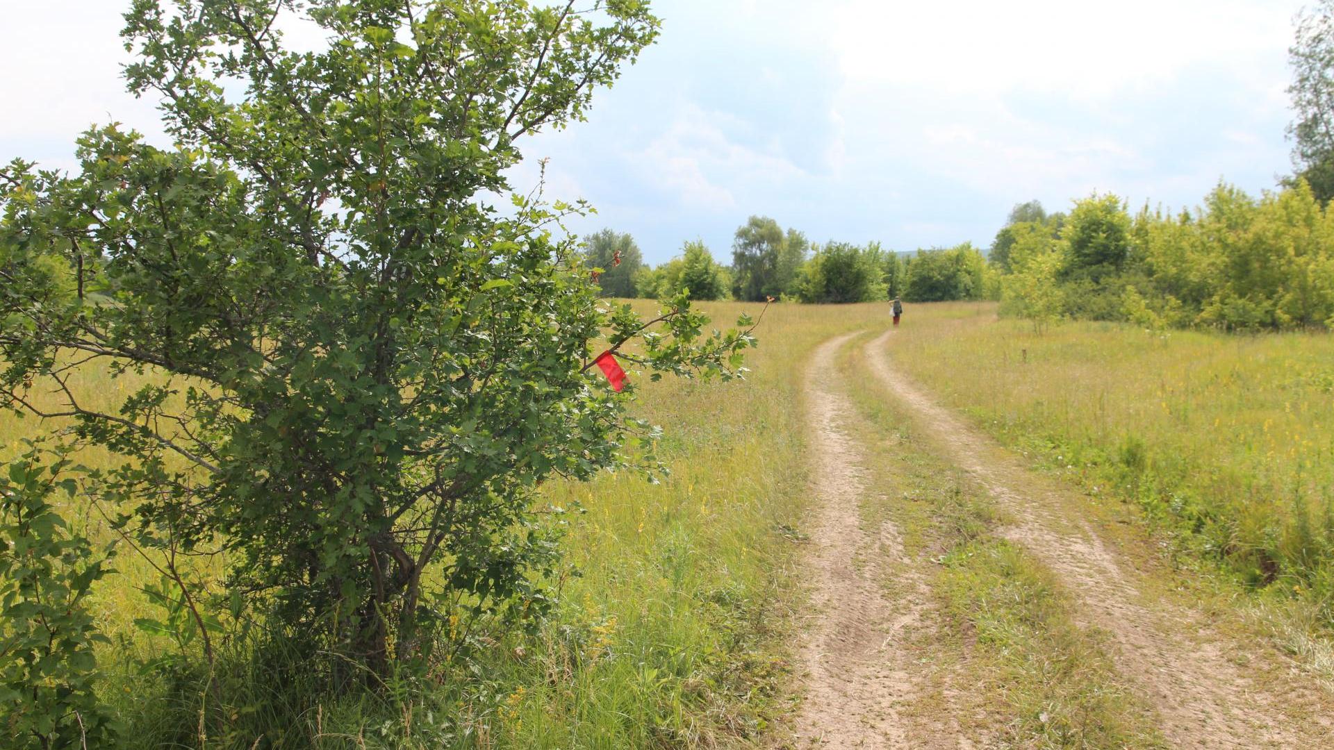 Затем тропа поворачивает налево, на юго-восток, и ещё 2,5 км идёт вдоль полосы деревьев до глиняного карьера, на краю которого обустроена площадка для отдыха. Отсюда, перейдя асфальтовую дорогу, можно выйти к опушке Выползовского бора, где находится нео-языческое капище и дом необычной круглой формы, построенный одним из местных жителей села Выползово.
