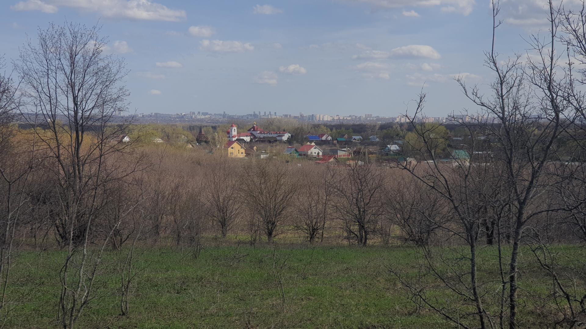 Сквозь просвет между деревьями открывается вид на городскую застройку Самары вдали, а на переднем плане панорама села Подгоры