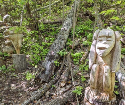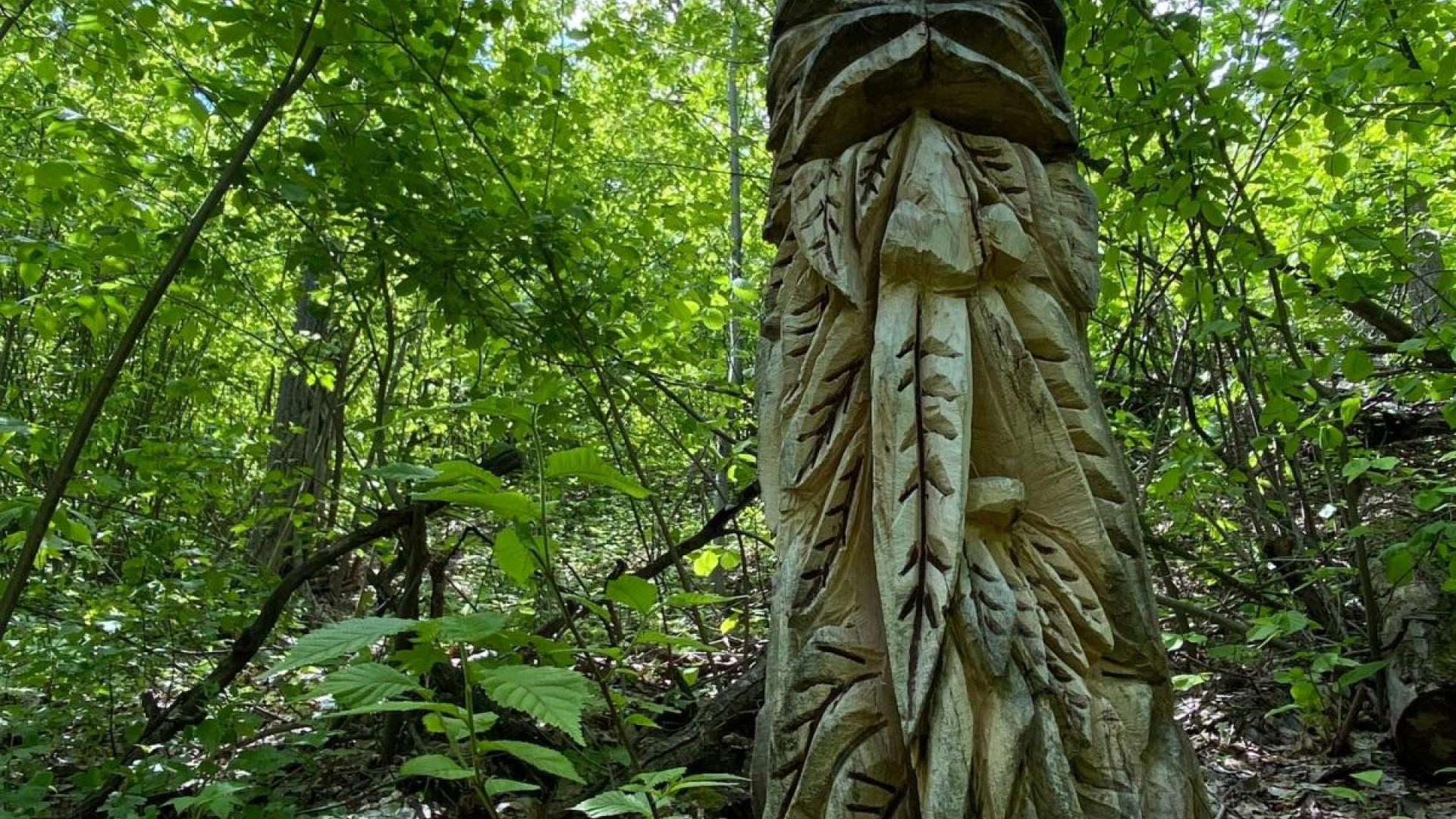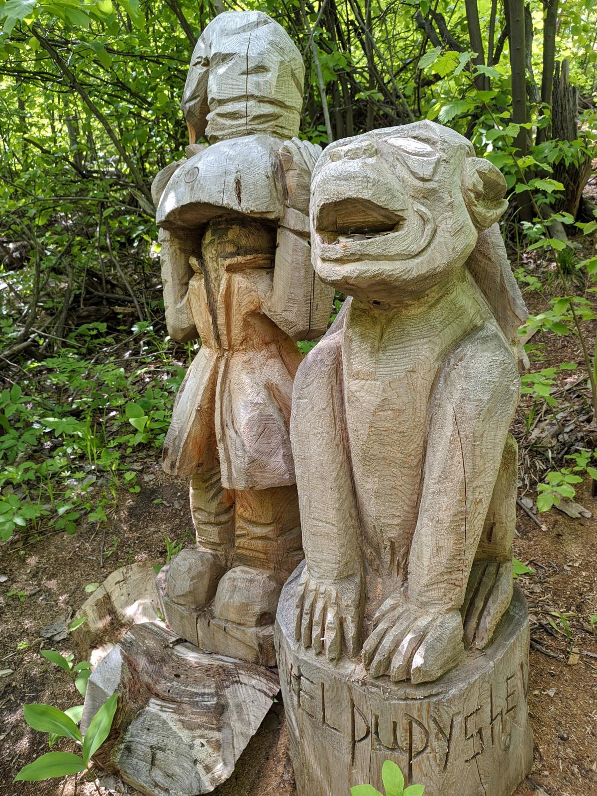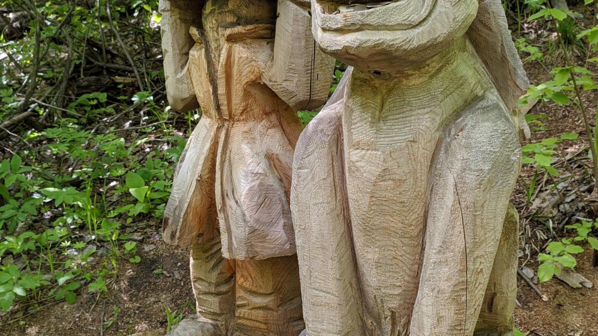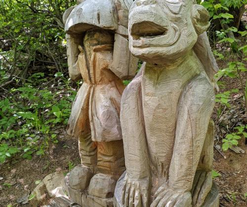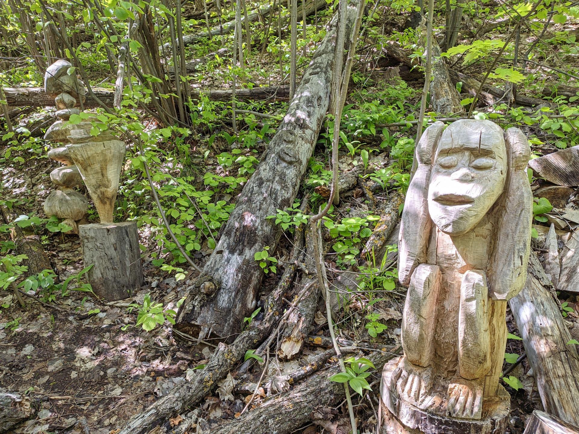 Вырезанные из дерева фигуры, стоящие на склоне Оврага сказок на подъеме от берега Волги к горе Шишка.