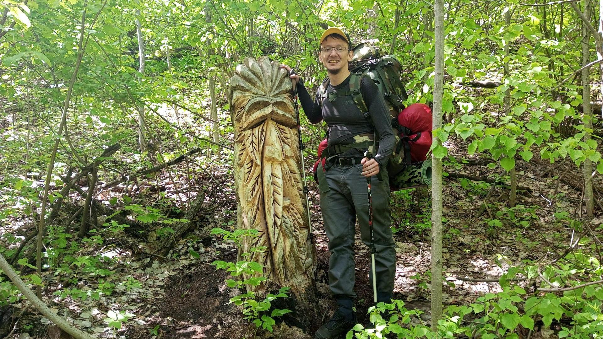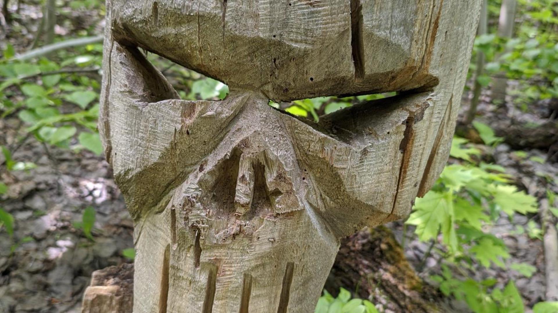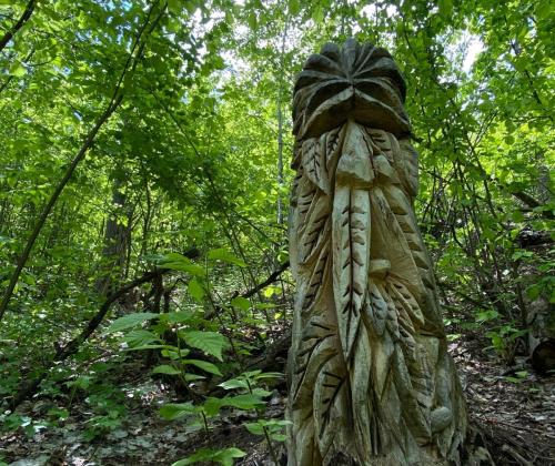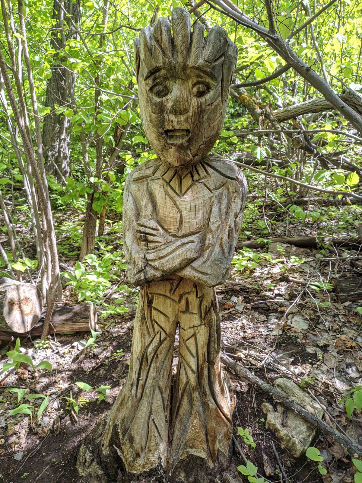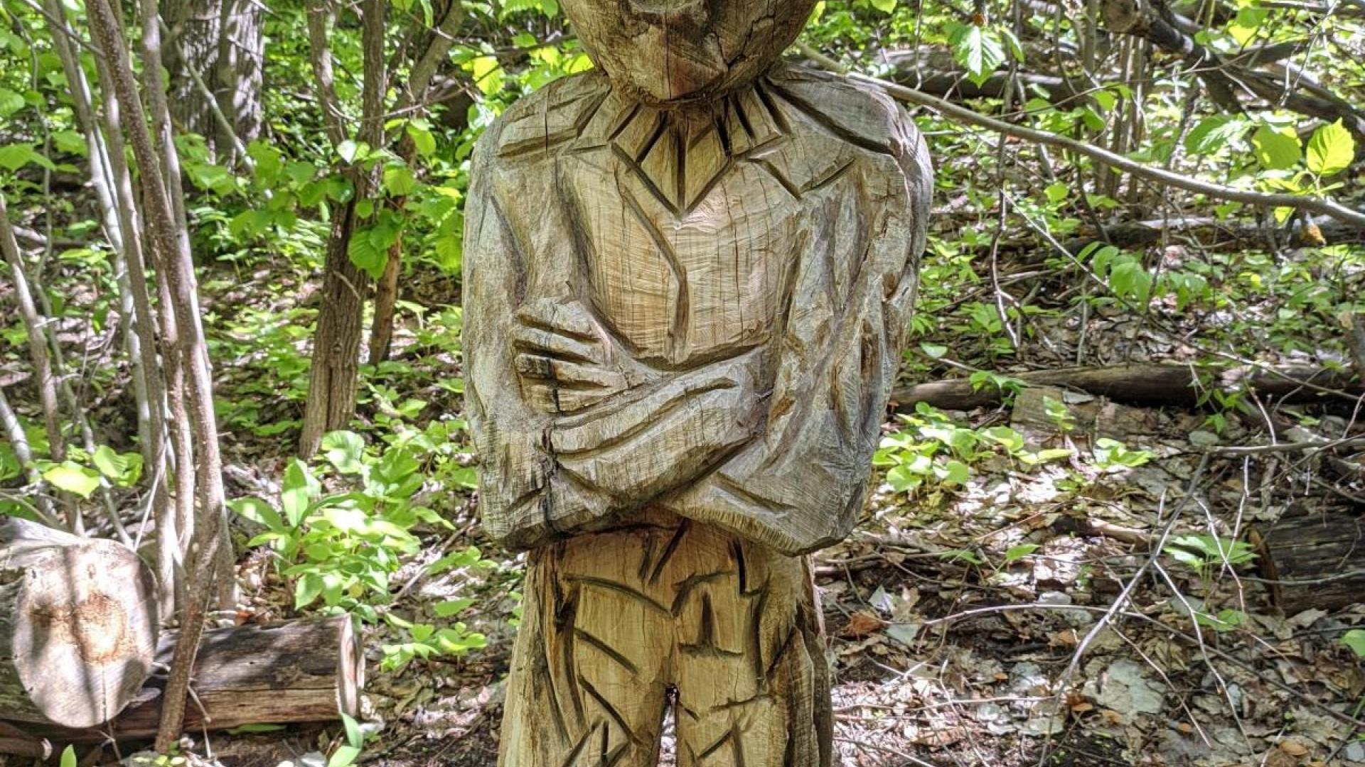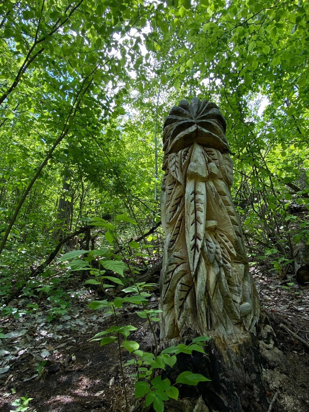 Вырезанные из дерева фигуры, стоящие на склоне Оврага сказок на подъеме от берега Волги к горе Шишка.