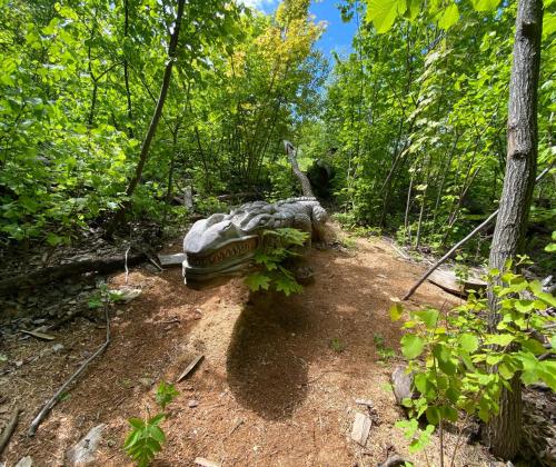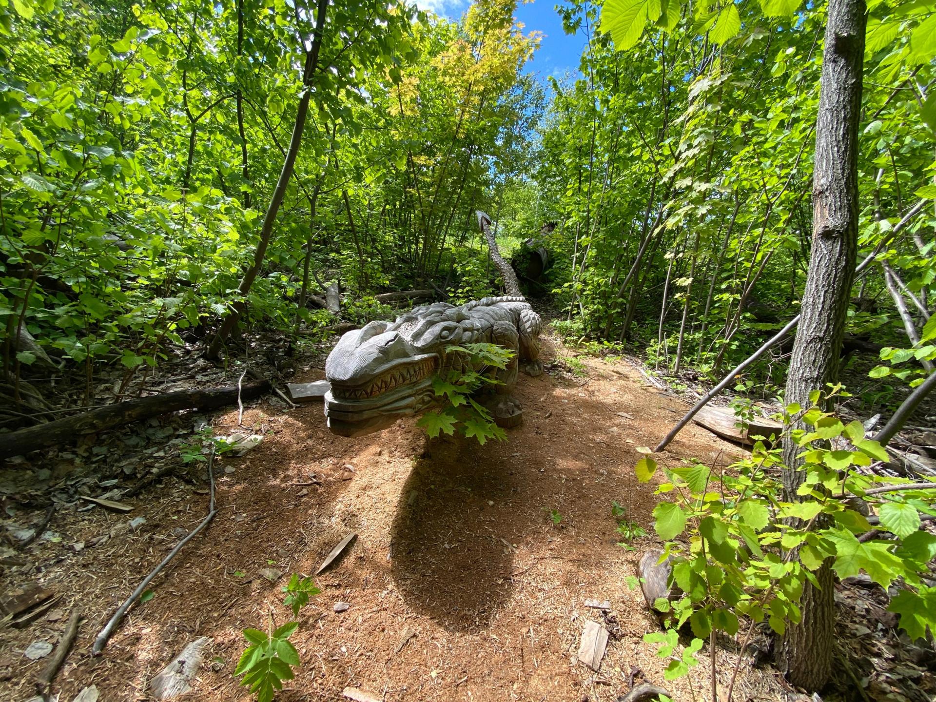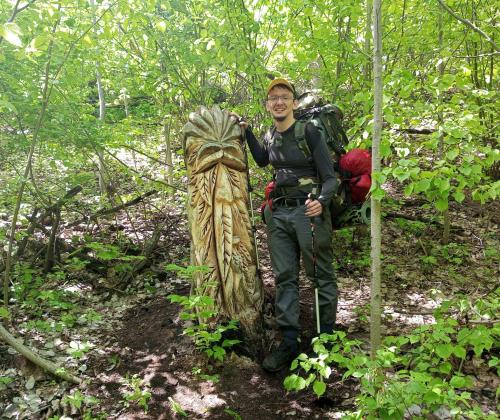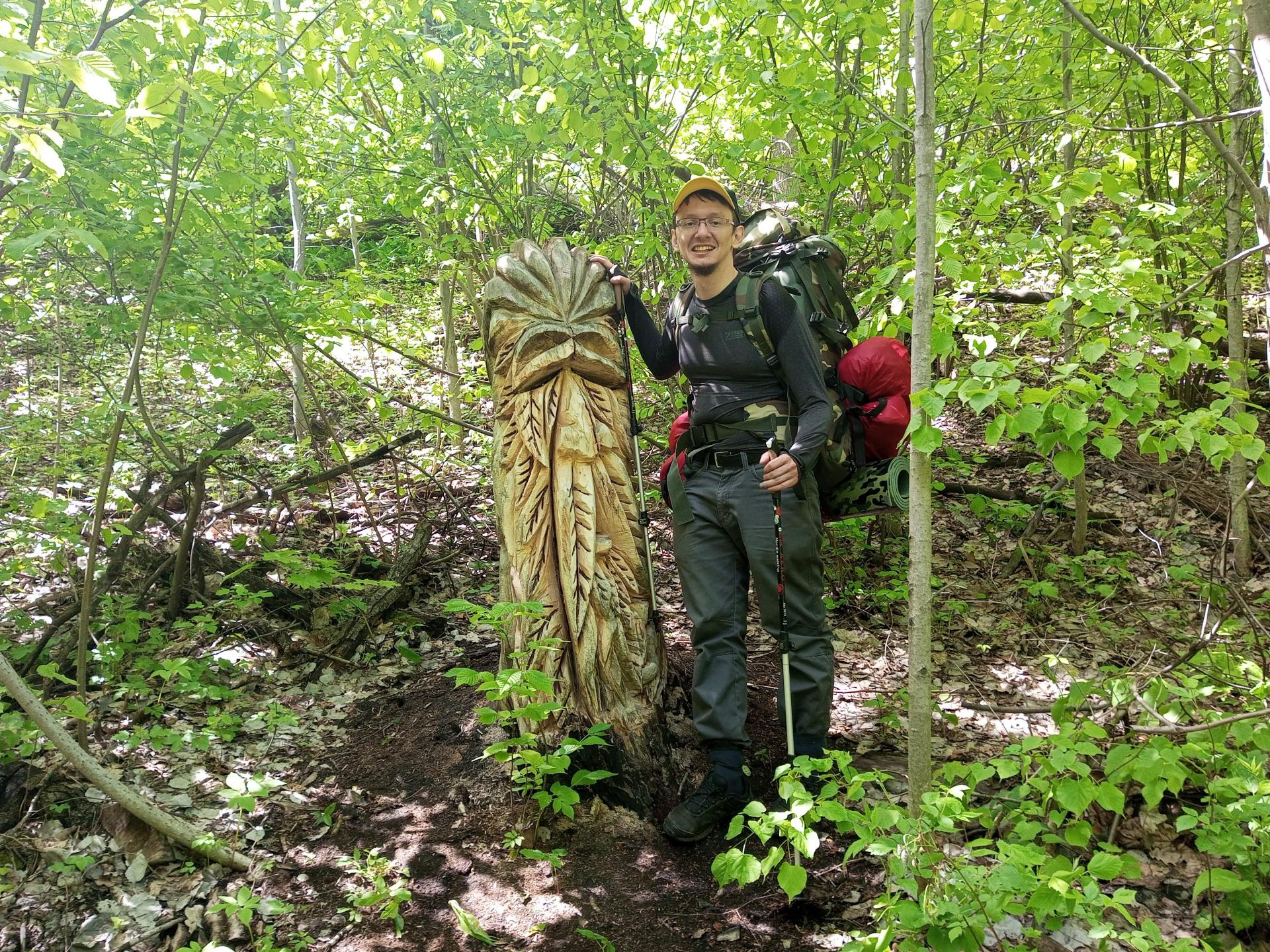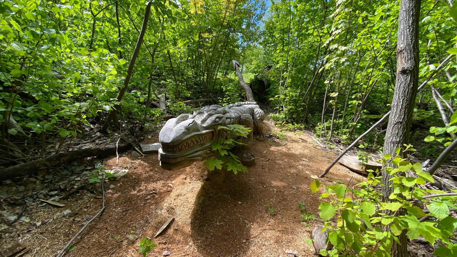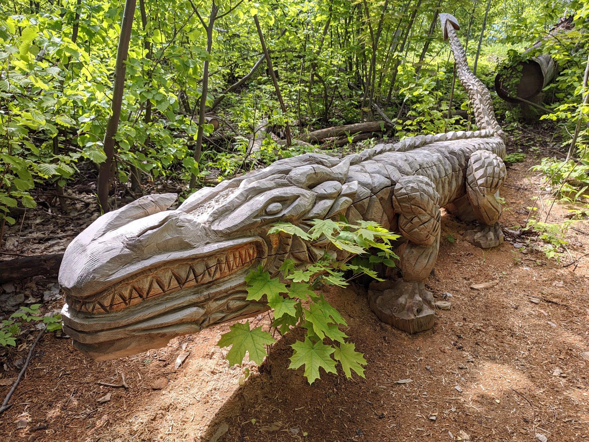 Вырезанные из дерева фигуры, стоящие на склоне Оврага сказок на подъеме от берега Волги к горе Шишка.