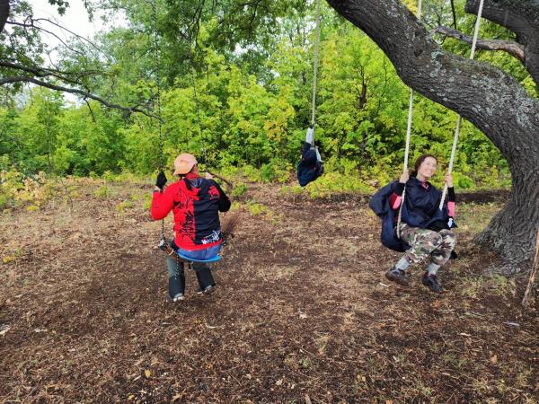 Несколько качелей на ветвях раскидистого дуба с видом на посёлок