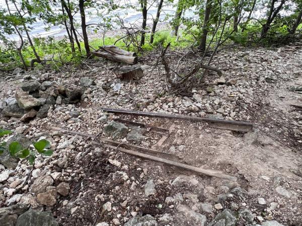 Стрелочный перевод от узкоколейной железной дороги, которая использовалась при откатке горной массы на каменном карьере «Крестовая поляна».