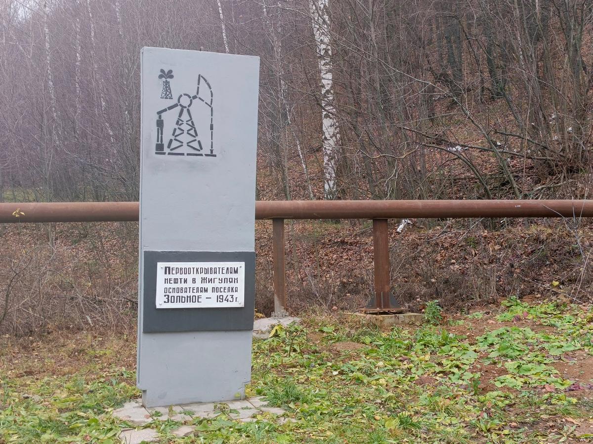Памятный знак «Первооткрывателям нефти в Жигулях основателям посёлка Зольное – 1943 г.» установлен в 1972 году. Монумент находится на вираже дороги у Головного оврага, в 3 км от центра посёлка.