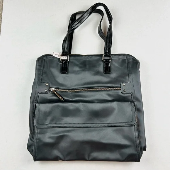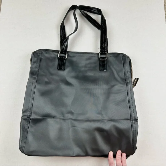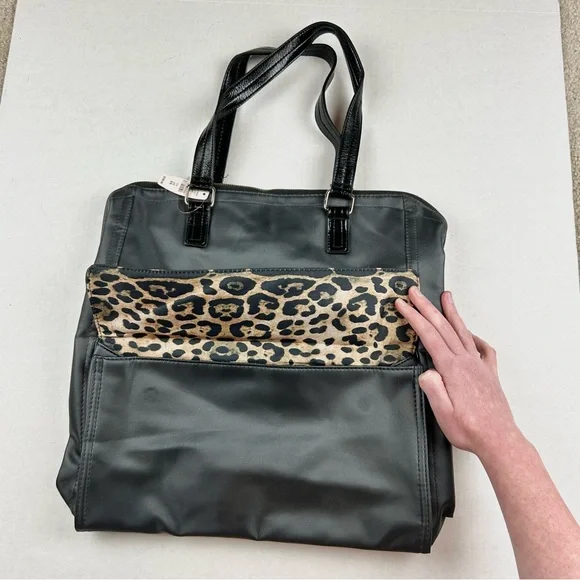 Victoria Secret's charcoal grey & leopard print travel bag. Black patent leather straps. Holds a good bit! Great for an overnight bag, the gym, or carry on bag for a plane, etc. Several zippers and snap pockets. There are hooks for a shoulder strap however, it doesn't come with a strap. Never used. New with tags!Lay flat measurements - 23.5" width, 15.5" height.